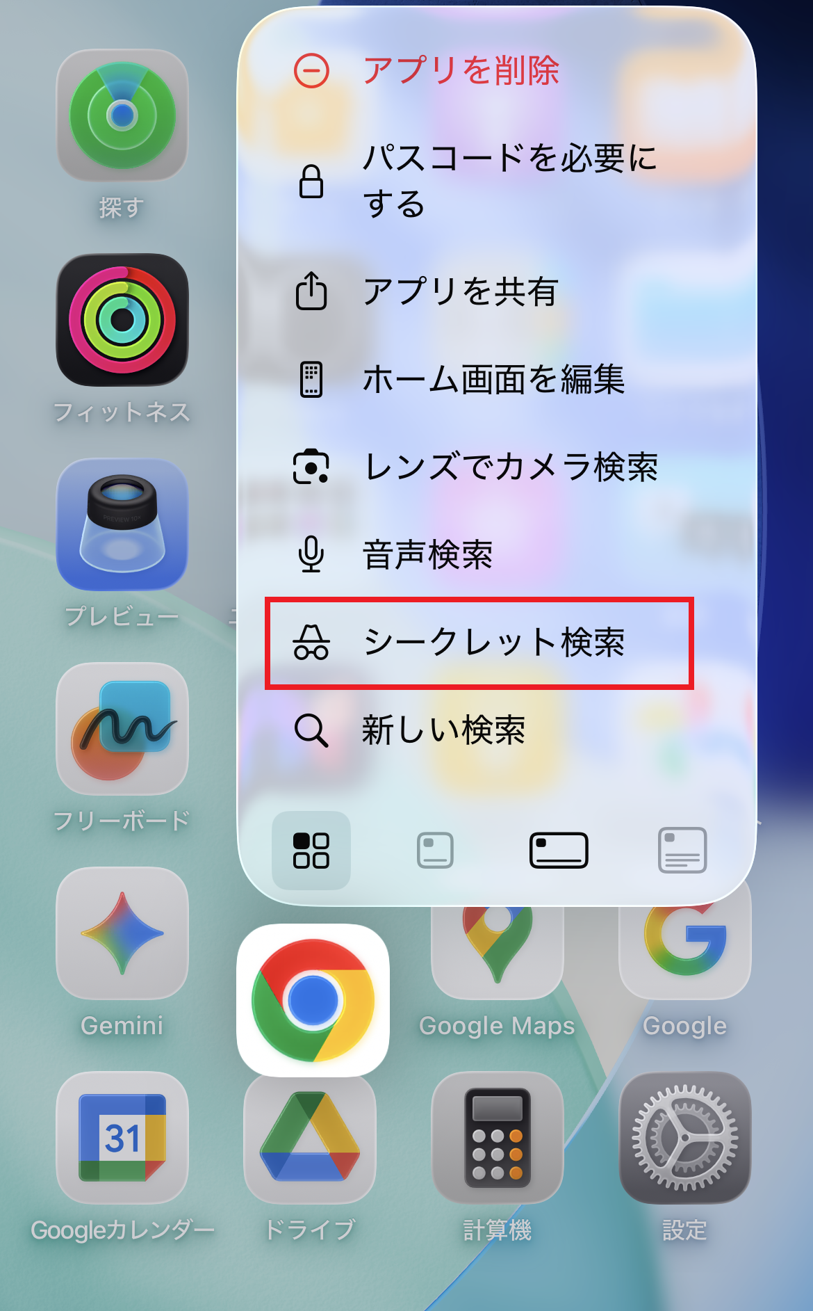 以下の様なサブメニューが表示されるので、その中から「シークレット検索」を選んで下さい。