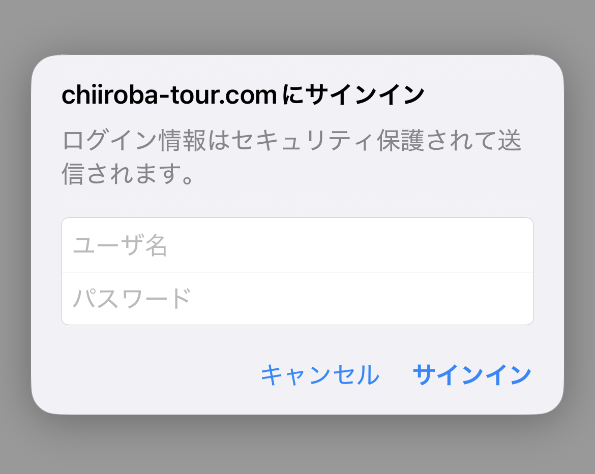 上記の画面が出て「ユーザ名」「パスワード」入力画面すら表示されない場合には、safariかChromeのアイコンの長押しから表示されるサブメニューの「新規プライベートタブ」あるいは「シークレット検索」から表示されたブラウザの検索窓に直接、https://chiiroba-tour.com/kaiin/ と入力するか、「ちいろば企画」と検索し公式サイトへ推移し会員専用サイトへログインを試みれば、「ユーザ名」「パスワード」入力画面が表示されるはずです。
